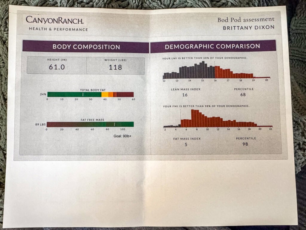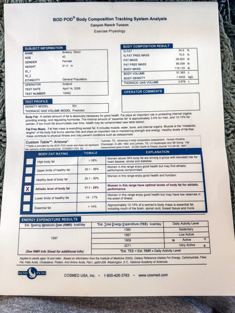 Overall I found the Bod Pod to be a very valuable experience. I’d love to do it again in a year to see how my body composition shifts. As we age, muscle becomes increasingly important for longevity so to have that info and knowledge on what my specific body needs to increase it is so helpful.