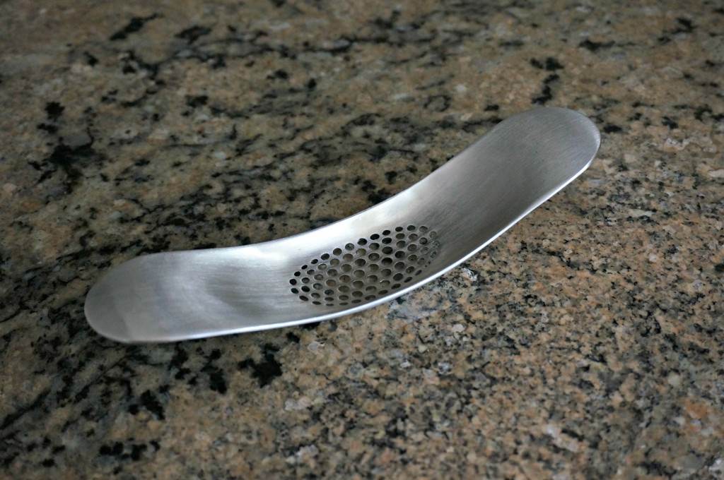A garlic rocker is a small tool, but it makes mincing garlic quick and easy. Instead of pulling out a knife and trying to finely chop garlic cloves or squeezing a garlic crusher, you rock the tool back and forth over the clove and it presses the garlic through the little holes.