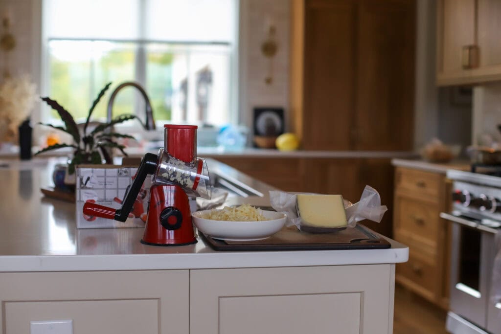 A rotary grater is one of those simple tools that makes a small task faster and less messy. There’s a reason it went viral! I use it most often for shredding cheese, mozzarella for pizza, parmesan for roasted veggies or pasta, and cheddar for wraps.